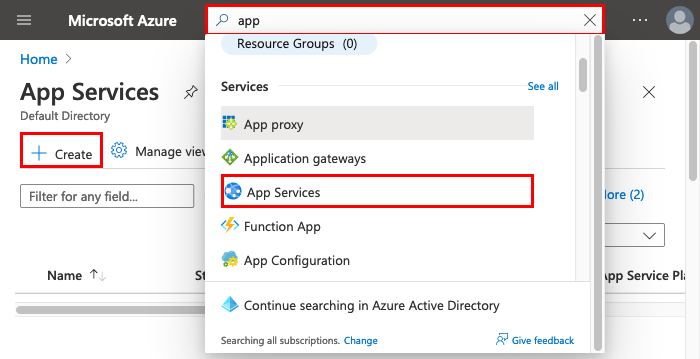 选择“创建资源”,然后在“Web 应用”下选择“创建”。