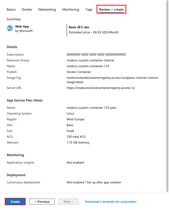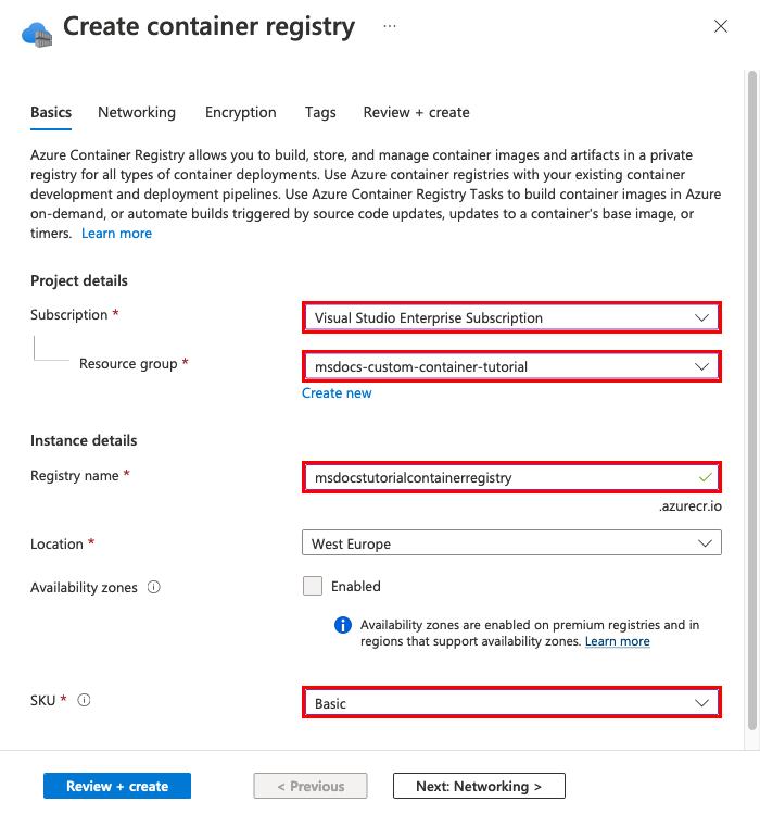使用下表中的建议值作为指南配置新的容器注册表。 完成后,选择“创建”。