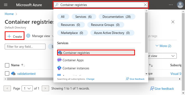 选择要在其中发布注册表的订阅,然后选择“ 新建”。