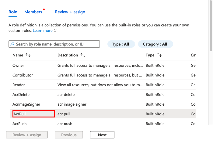 az role assignment create --assignee $principalId --scope $registryId --role "AcrPull"有关这些权限的详细信息,请参阅什么是 Azure 基于角色的访问控制?