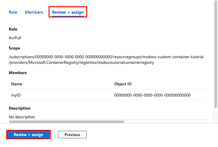 registryId=$(az acr show --resource-group msdocs-custom-container-tutorial --name <registry-name> --query id --output tsv)授予托管标识访问容器注册表的权限: