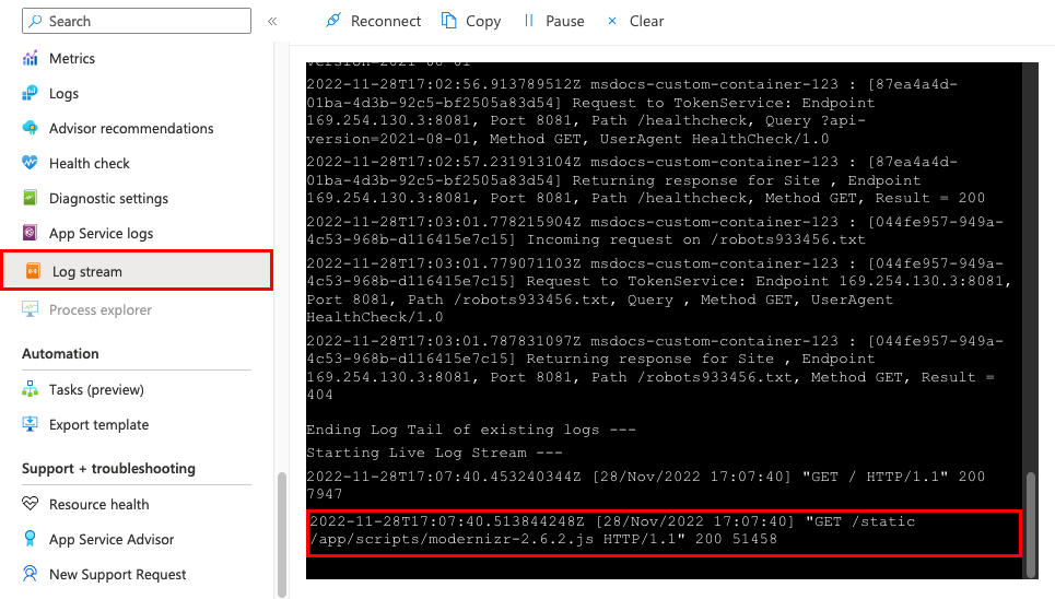 az webapp log tail --name <app-name> --resource-group msdocs-custom-container-tutorial如果没有立即看到控制台日志,请在 30 秒后重新查看。