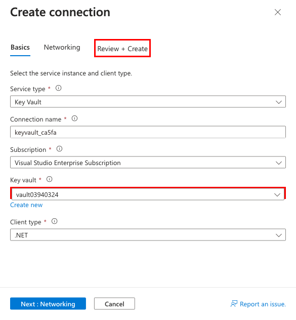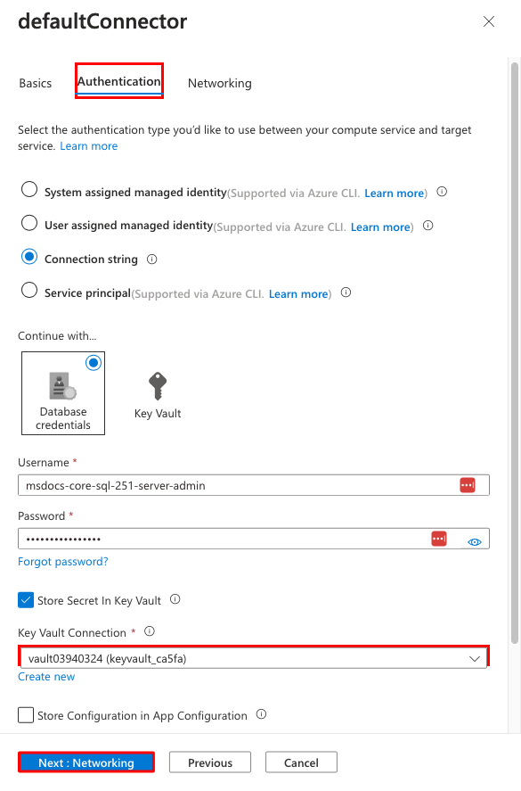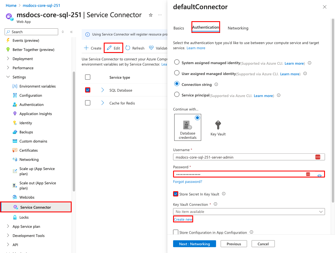 创建向导已为你生成作为 .NET 连接字符串和应用设置的连接变量。 但是,安全最佳做法是将机密完全排除在应用服务之外。 你需要借助服务连接器将机密移动到密钥保管库,并将应用设置更改为 Key Vault 引用。