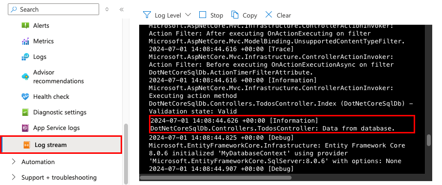 Stream App Service logs at: <URL>