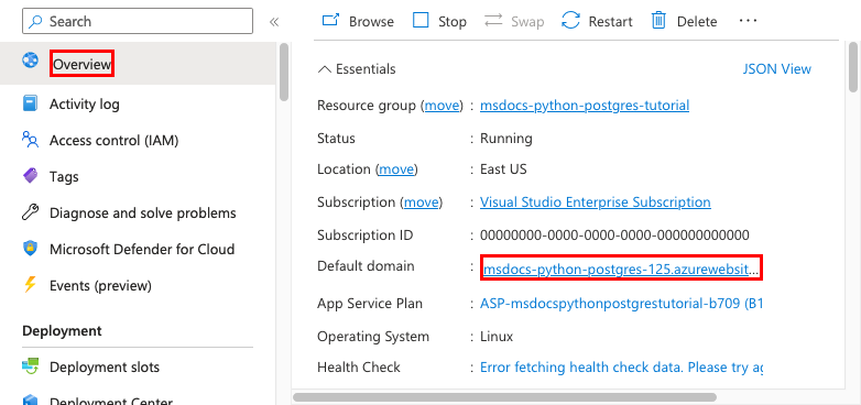如果遇到与连接数据库相关的任何错误,请检查应用设置 (AZURE_POSTGRESQL_CONNECTIONSTRING) 是否已更改。 如果没有该连接字符串,则 migrate 命令将无法与数据库通信。