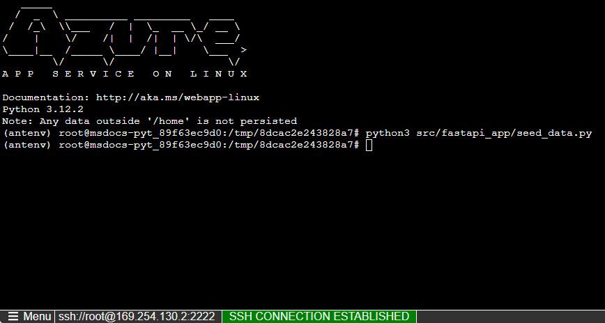 在本节中,你将手动运行此命令以进行演示。 在 PostgreSQL 数据库受虚拟网络保护的情况下,运行该命令的最简单方法是使用应用服务容器在 SSH 会话中运行。
