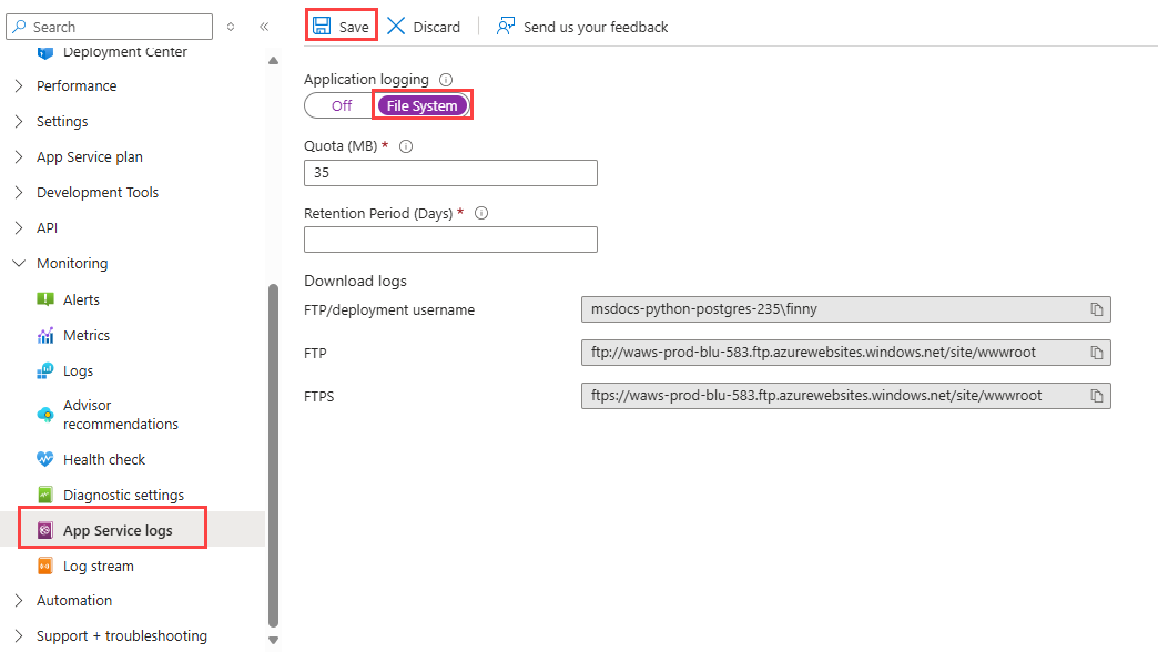 Azure 应用服务可以捕获日志,以帮助你诊断应用程序的问题。 为方便起见,azd 模板已 启用对本地文件系统的日志记录。