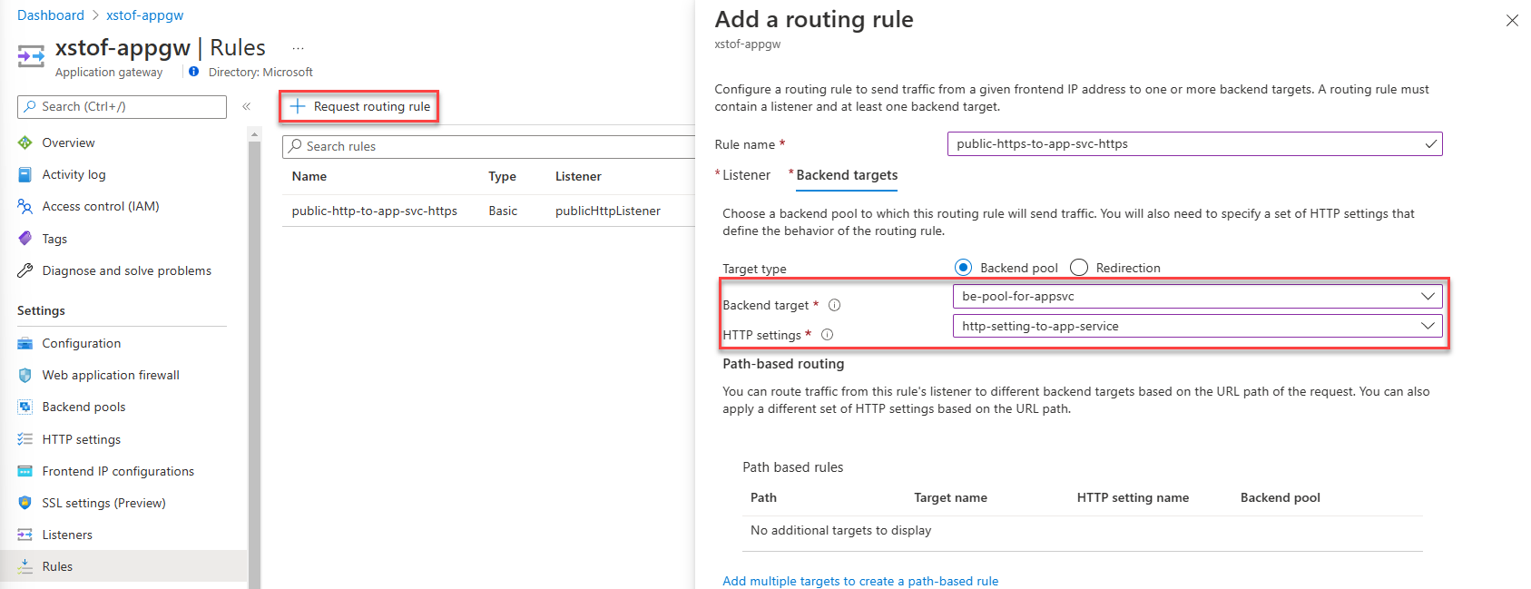 - 在“后端目标”下,选择已配置了应用服务的后端池