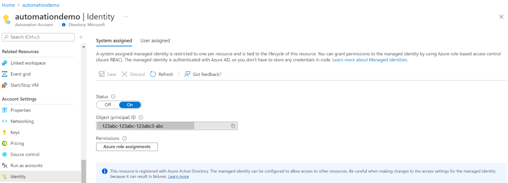 自动化帐户现在可以使用系统分配的标识,该标识已注册到 Microsoft Entra ID,并由对象 ID 表示。