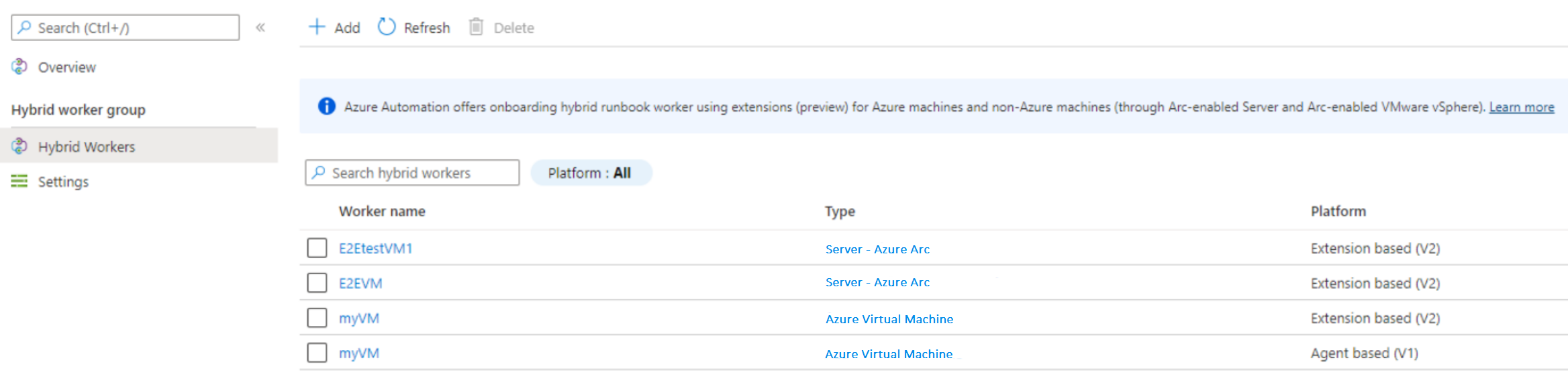 混合辅助角色可与两个平台共存:“基于代理(V1)”和“基于扩展(V2)” 。 如果在已运行“基于代理 (V1)”平台的混合辅助角色上安装“基于扩展 (V2)”平台,则会在组中看到两个混合 Runbook 辅助角色条目。 一个基于平台扩展(V2),另一个基于代理(V1)。 了解详细信息