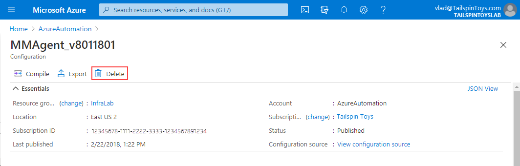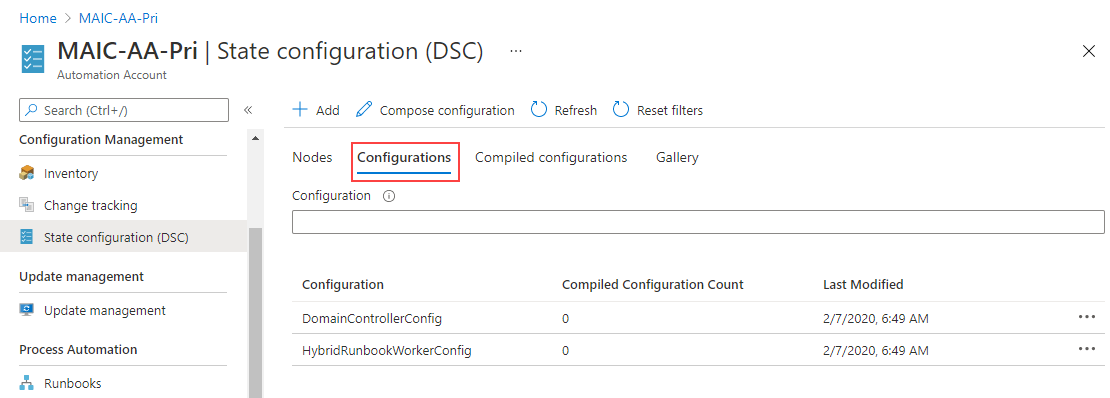 - 如果要重新添加配置和重新编译,请参阅在 Azure 自动化 State Configuration 中编译 DSC 配置。