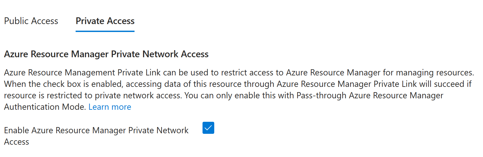 仅当使用 直通 身份验证模式时,才能启用 Azure 资源管理器专用网络访问。
