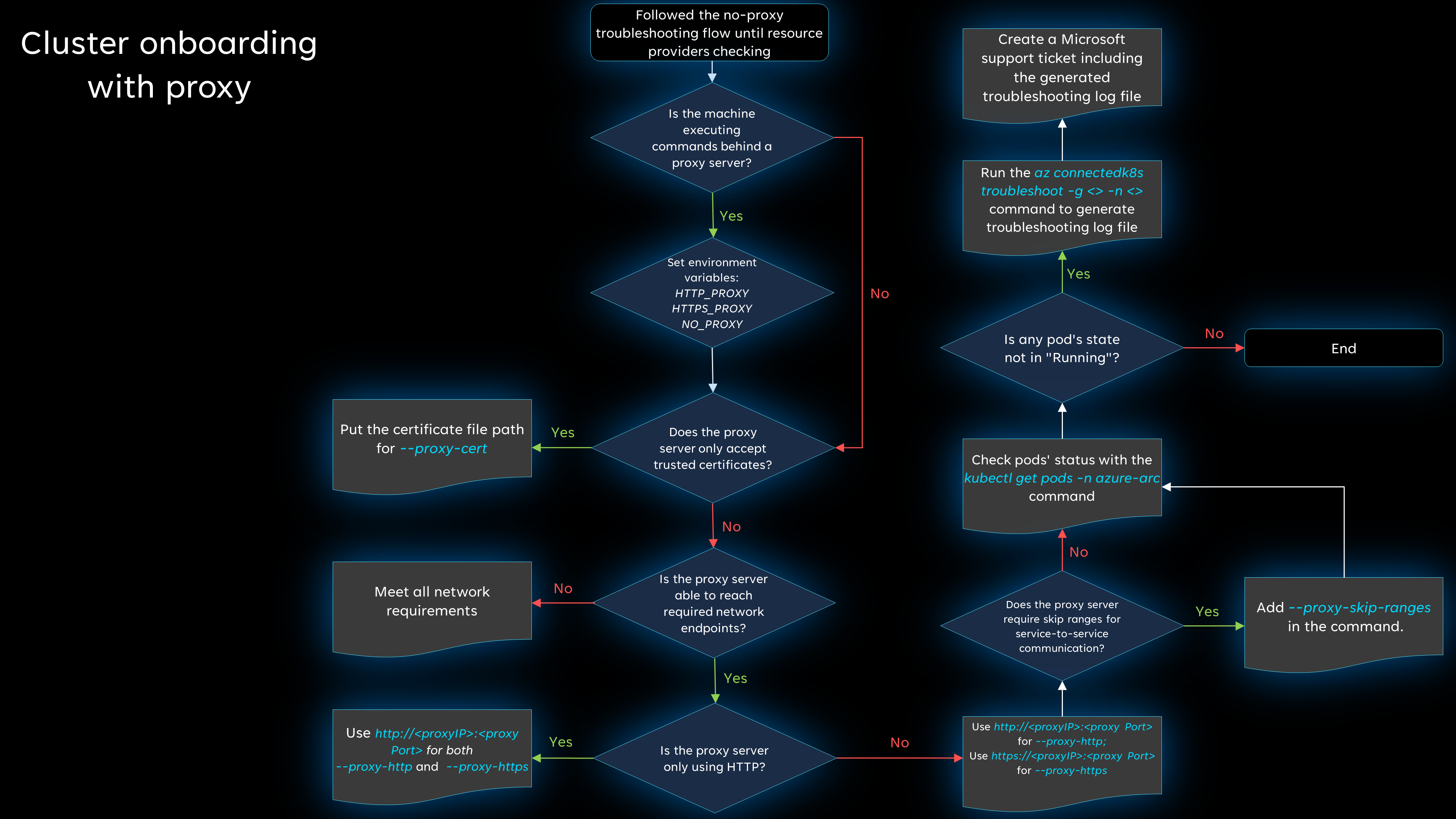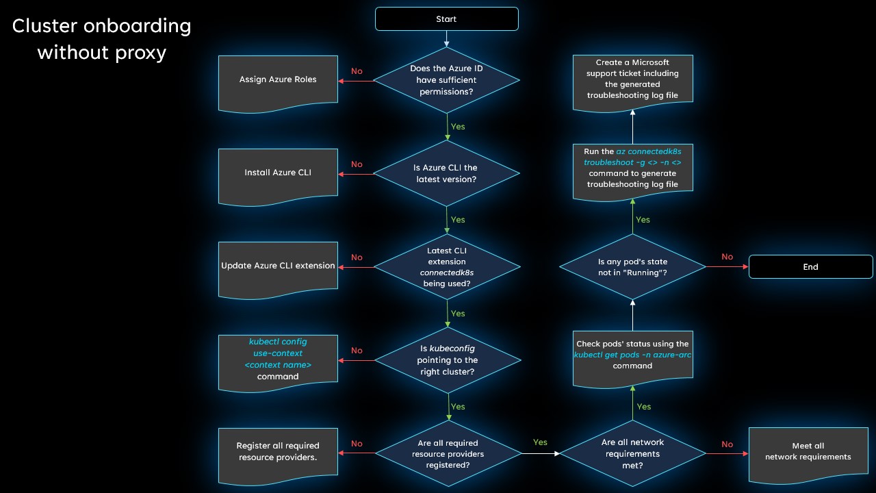 如果在将群集连接到 Azure Arc 时遇到问题,问题很可能是本文中列出的问题之一。 两个流程图提供引导式帮助:一个适用于不 使用代理服务器的情况,另一个则适用于网络连接 使用代理服务器的情况。