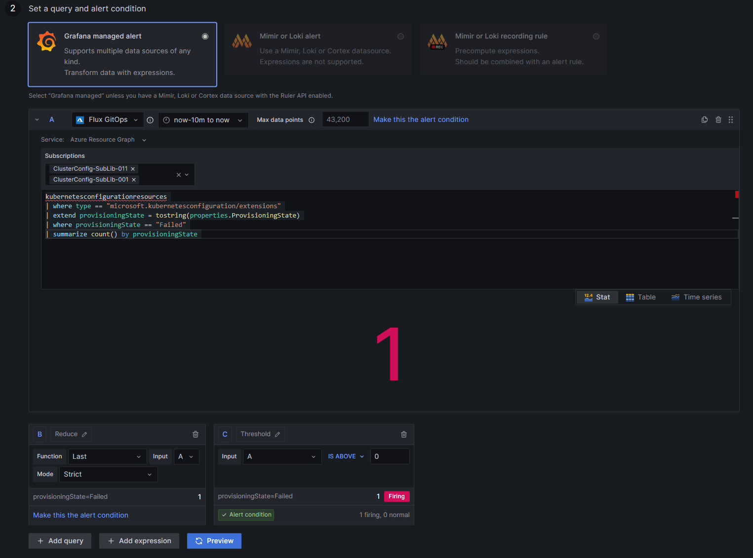 kubernetesconfigurationresources | where type == "microsoft.kubernetesconfiguration/fluxconfigurations" | extend complianceState=tostring(properties.complianceState) | where complianceState == "Non-Compliant" | summarize count() by complianceState对于“阈值”框,选择“A”作为输入类型,并将阈值设置为“0”,以便即使群集上只有一个扩展失败时也能接收警报。 将此标记为“警报条件”。