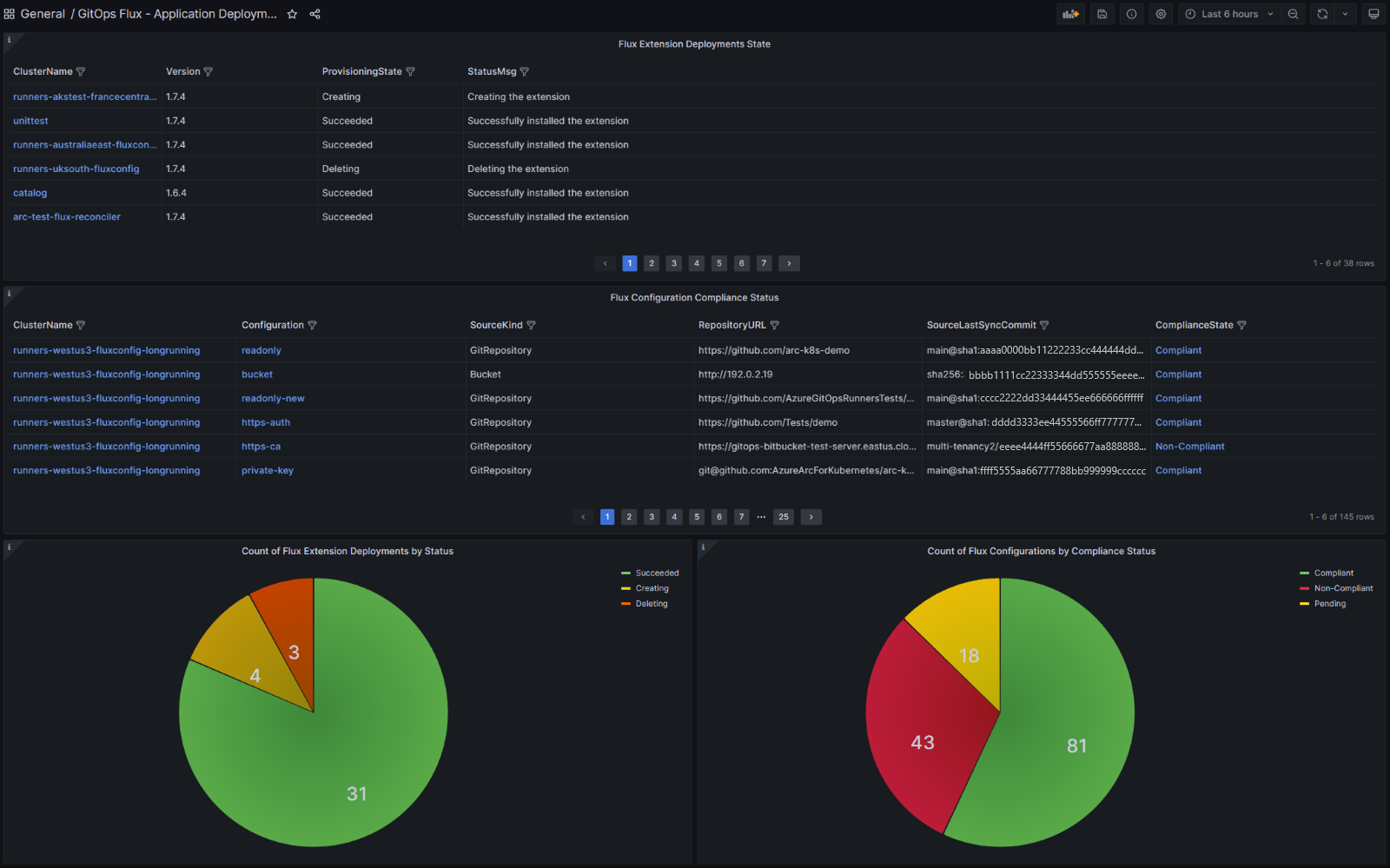 例如,在“Flux 配置符合性状态”表中,可以从“SourceLastSyncCommit”列选择特定的提交。 通过此操作,可以跟踪该提交影响的所有群集的配置部署状态。