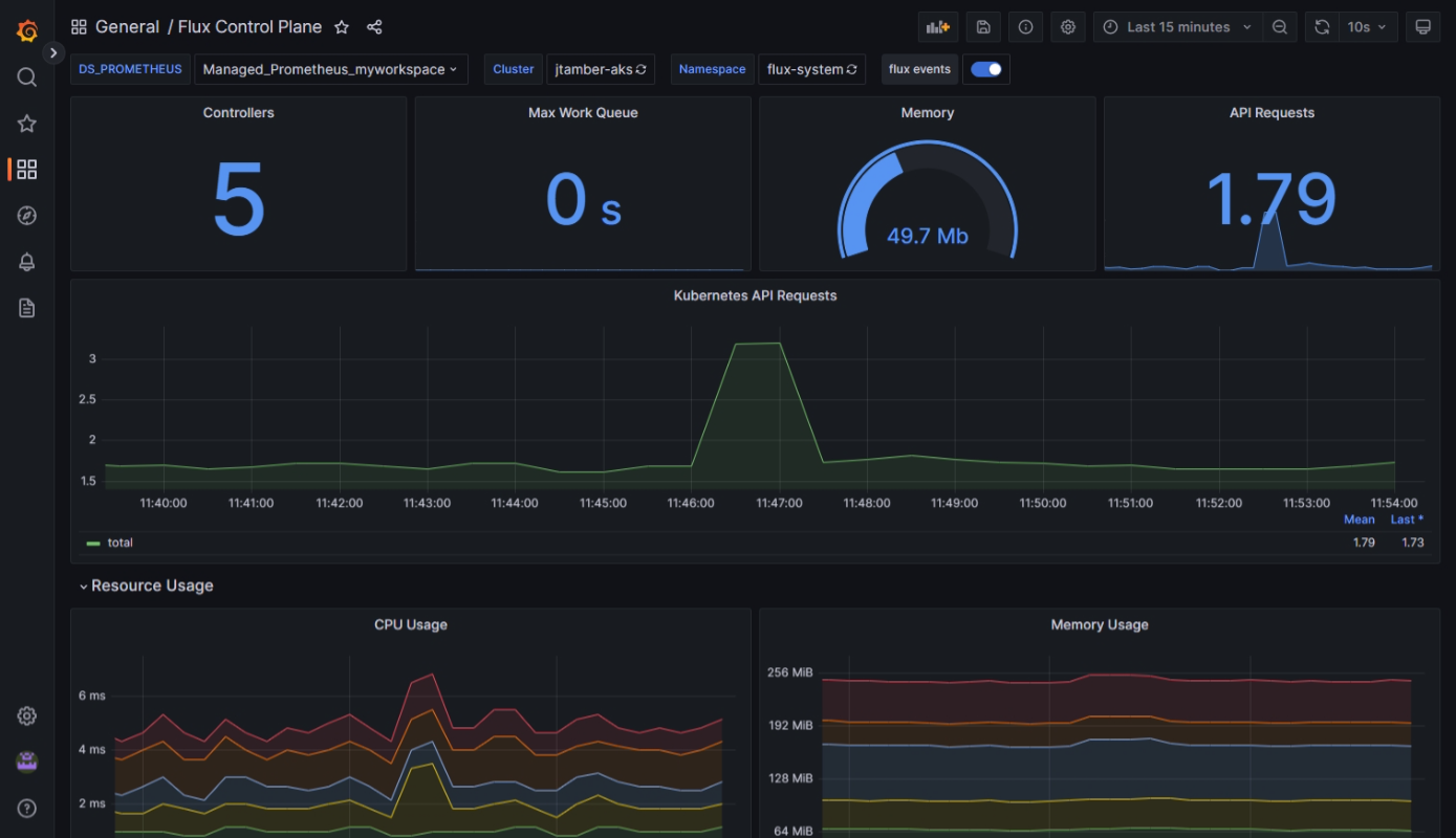 Flux 控制平面仪表板可显示有关资源消耗状态、群集级别的协调和 Kubernetes API 请求的详细信息。