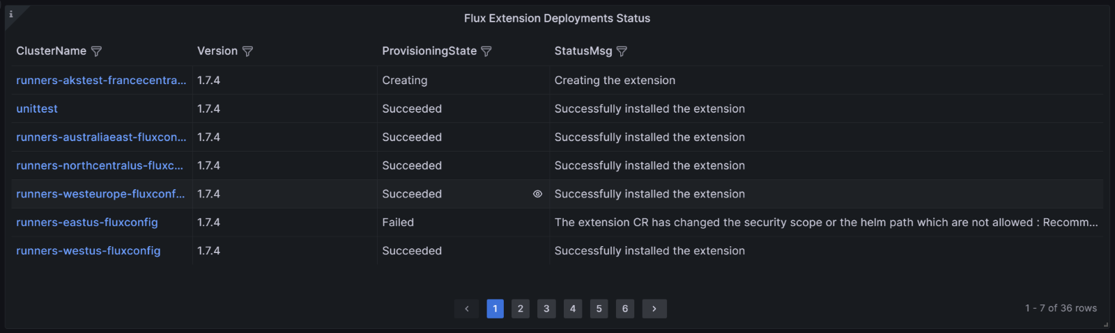 “Flux 扩展部署状态”表列出了部署 Flux 扩展的所有群集,以及当前部署状态。