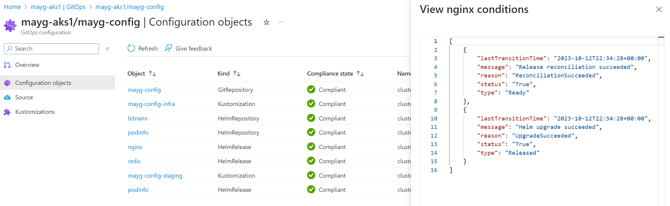 在群集上创建 Flux 配置后,可以通过导航到群集并从服务菜单中选择“GitOps”在 Azure 门户中查看状态信息。