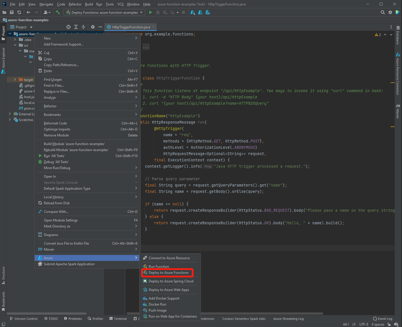 在 IntelliJ 项目资源管理器中选择并展开 Azure 图标,然后选择“部署到 Azure -> 部署到 Azure Functions”。