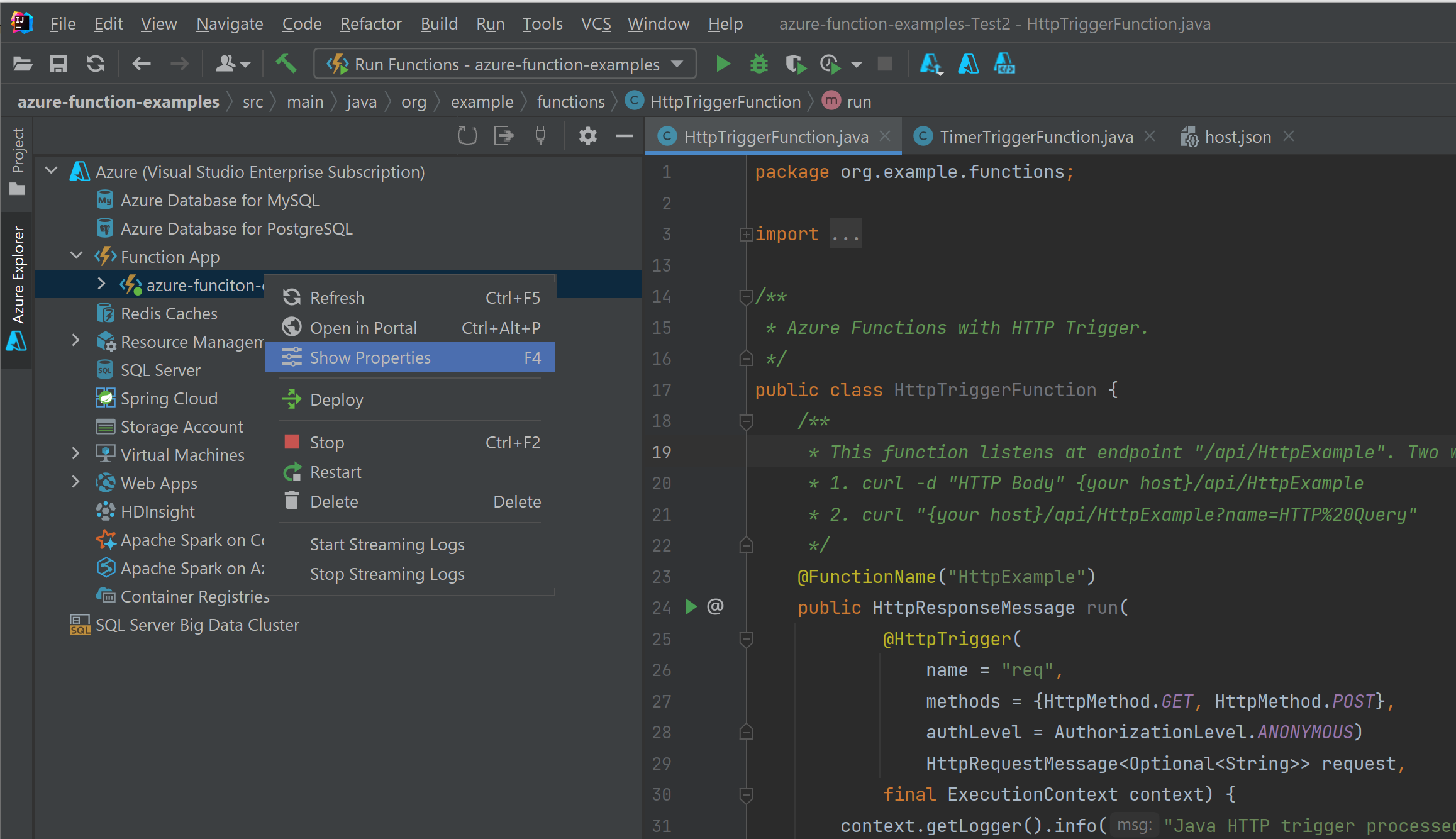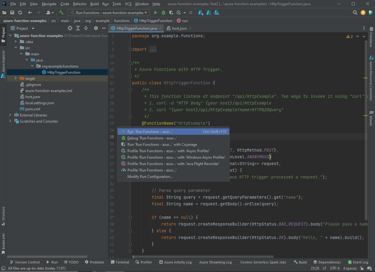 导航到 src/main/java/org/example/functions/HttpTriggerJava.java,查看生成的代码。 在第 17 行旁边,将会看到绿色的“运行”按钮。 选择该按钮,然后选择“运行 'Functions-azur…'”。 你应看到函数应用在本地运行,其中包含一些日志。