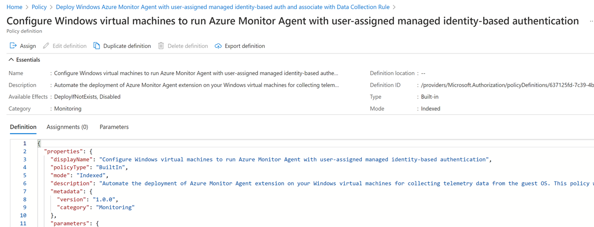可以使用 Azure Policy 在现有和新的虚拟机上自动安装 Azure Monitor 代理,并让相关数据收集规则 (DCR) 自动与这些虚拟机关联。 本文介绍可将哪些内置策略和计划用于此功能和可帮助管理它们的 Azure Monitor 功能。