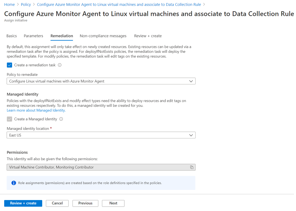Azure Monitor 提供预览版 DCR 体验,可简化使用 DCR 的策略和计划的分配创建过程。 该体验包括安装 Azure Monitor 代理的计划。 可以选择使用该体验来为本文中所述的举措创建任务。 有关详细信息,请参阅在 Azure Monitor 中管理数据收集规则关联。