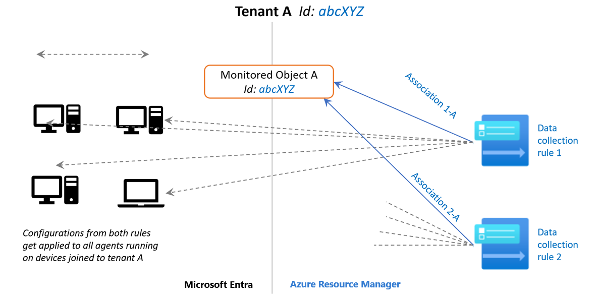 | 将配置规则关联到代理 | DCR 直接关联到单个 VM 资源 | DCR 与一个受监视的对象关联,该对象映射到 Microsoft Entra 租户内的所有设备。 |