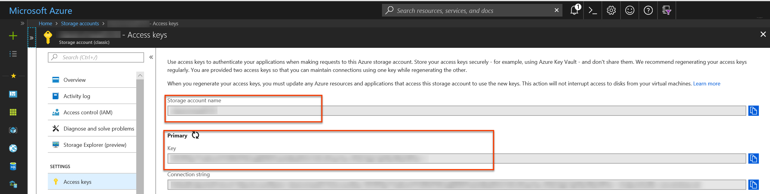 在 Azure 门户中,转到“存储帐户”资源窗格。 选择“密钥”,并记下存储帐户名称和存储帐户密钥。 在后续步骤中需要使用此信息。
