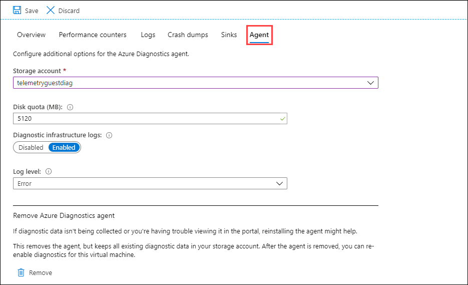 在“代理”选项卡中,可以更改存储帐户、设置磁盘配额,并指定是否收集诊断基础结构日志。