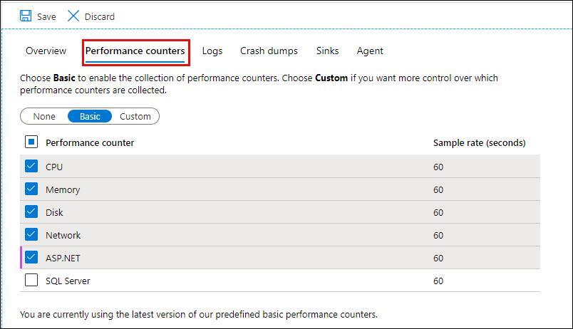 可以在 Azure 门户中的单个虚拟机上安装和配置诊断扩展。 你将通过接口进行操作,而不是直接操作配置。 启用诊断扩展时,它会自动使用包含最常见性能计数器和事件的默认配置。 可根据具体要求修改此默认配置。