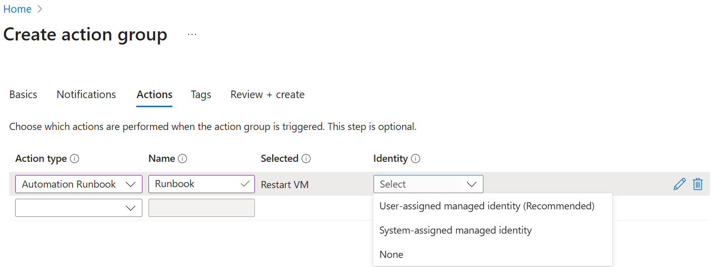 1. 通过添加新动作(动作类型为自动化 Runbook)并从下拉列表中选择相同的 Runbook,来编辑动作组。