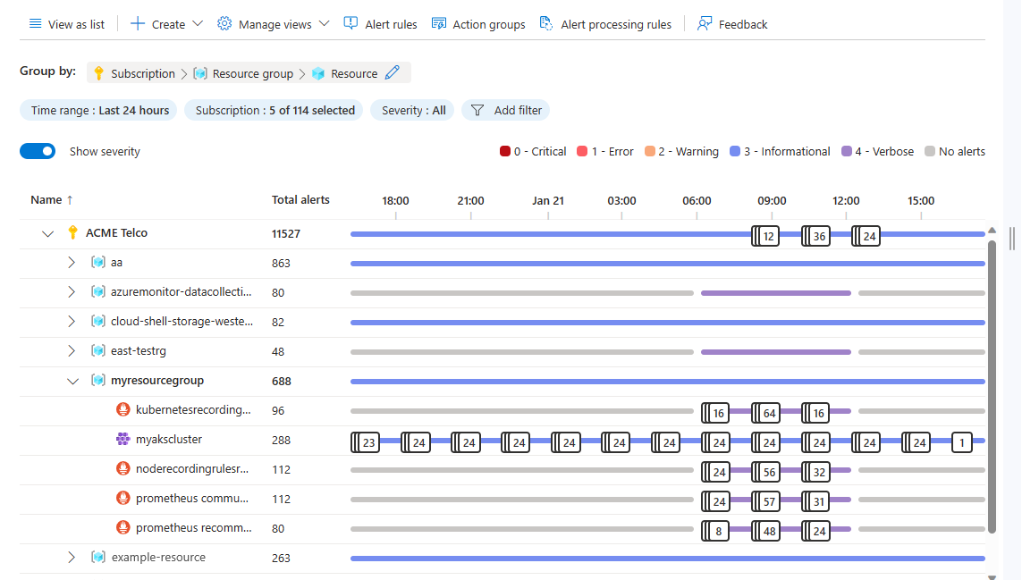 可以在时间线视图中查看警报。 在此视图中,可以看到在特定时间范围内触发的警报数。 时间线显示触发警报的资源,以便提供 Azure 层次结构中警报的上下文。 警报按触发时间分组。 可以按严重性、资源等筛选警报。 还可以选择特定时间范围以查看在该时间范围内触发的警报。