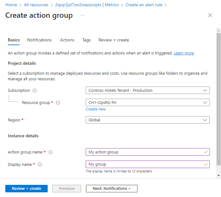 为该操作组选择订阅和资源组,指定要在门户中显示的操作组名称,及其在电子邮件和短信通知中显示的显示名称 。