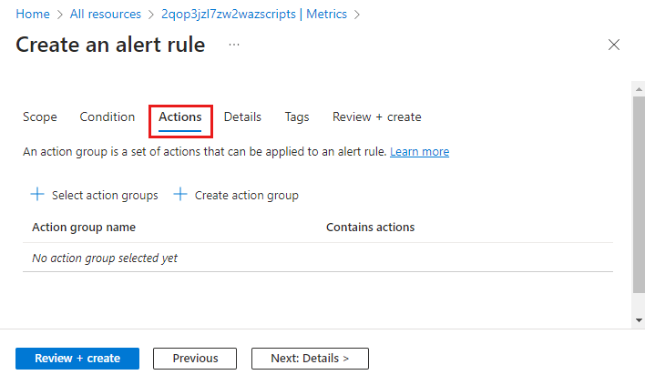 单击“选择操作组”来向警报规则添加一个操作组。