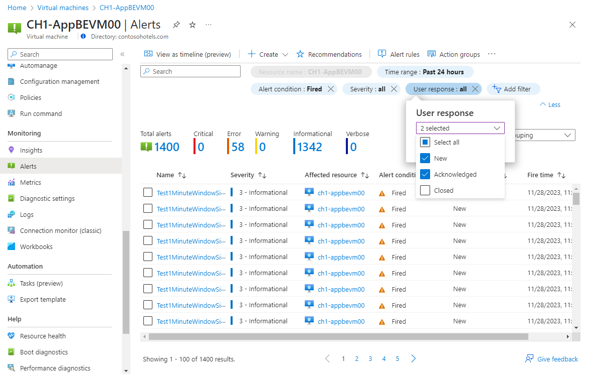 单击严重性可显示具有该严重性的警报。 选择“用户响应”并取消选择“已关闭”,以仅查看尚未解决的警报。