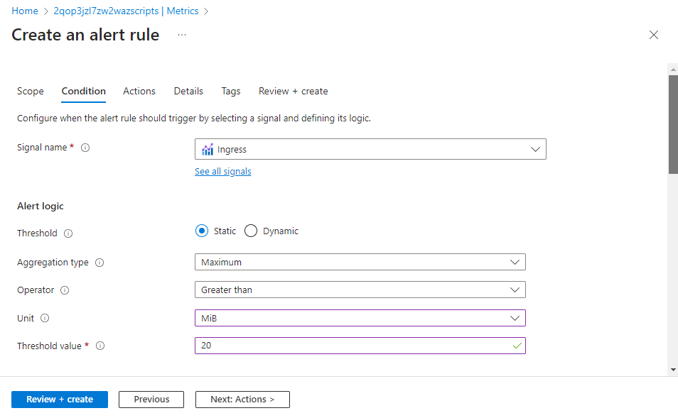 资源已被选中。 你需要修改信号逻辑以便为警报规则指定阈值和任何其他详细信息。