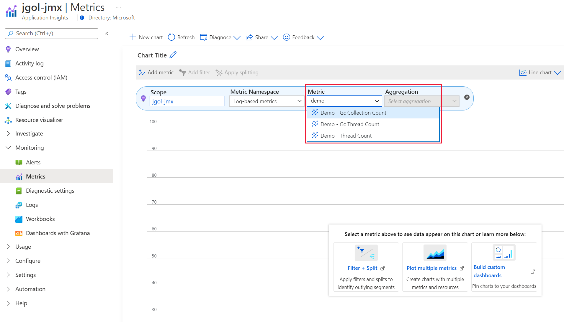 可以通过在 Azure 门户中导航到 Application Insights 资源来查看应用程序运行时收集的 JMX 指标。 在“ 指标 ”窗格中,选择下拉列表,如下所示以查看指标。