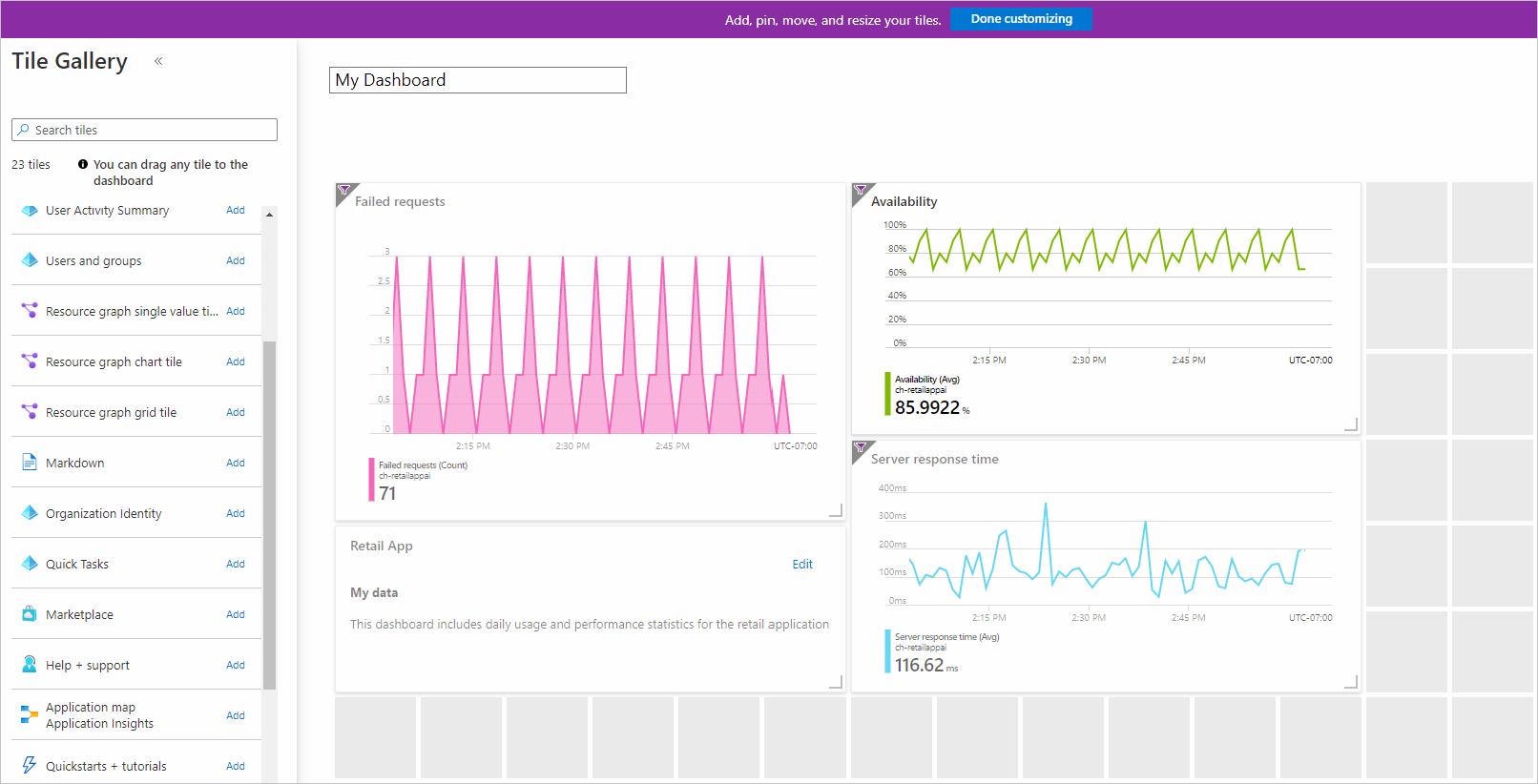 查看“磁贴库”,了解可以添加到仪表板中的各种磁贴。 还可以将 Application Insights 中的图表和其他视图直接固定到仪表板。