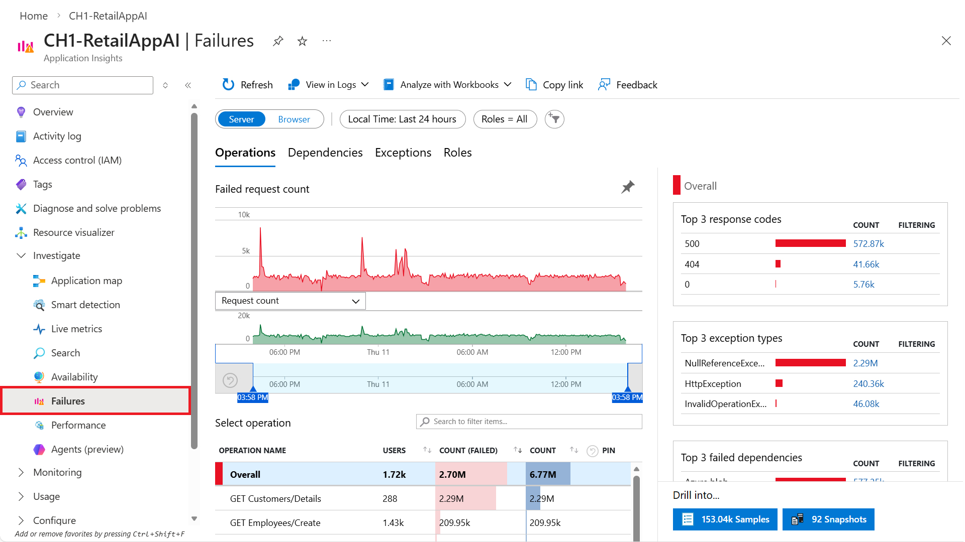 选择各个磁贴即可导航到相应的体验。 例如,选择“失败的请求”磁贴将打开“失败”体验。
