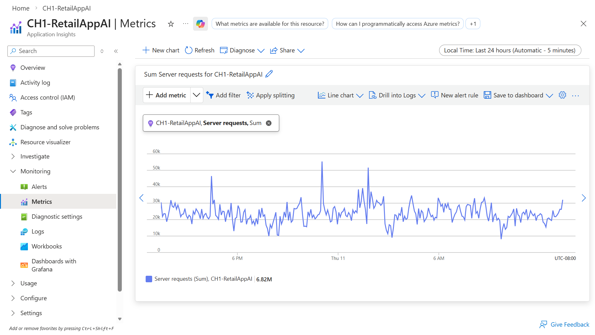 可以使用“指标”面板逐渐将 Application Insights 收集的指标绘入图表,筛选器和分组为可选内容。 像 Application Insights 中的其他内容一样,你可以将此图表添加到仪表板。 此步骤需要你先执行少量自定义操作。
