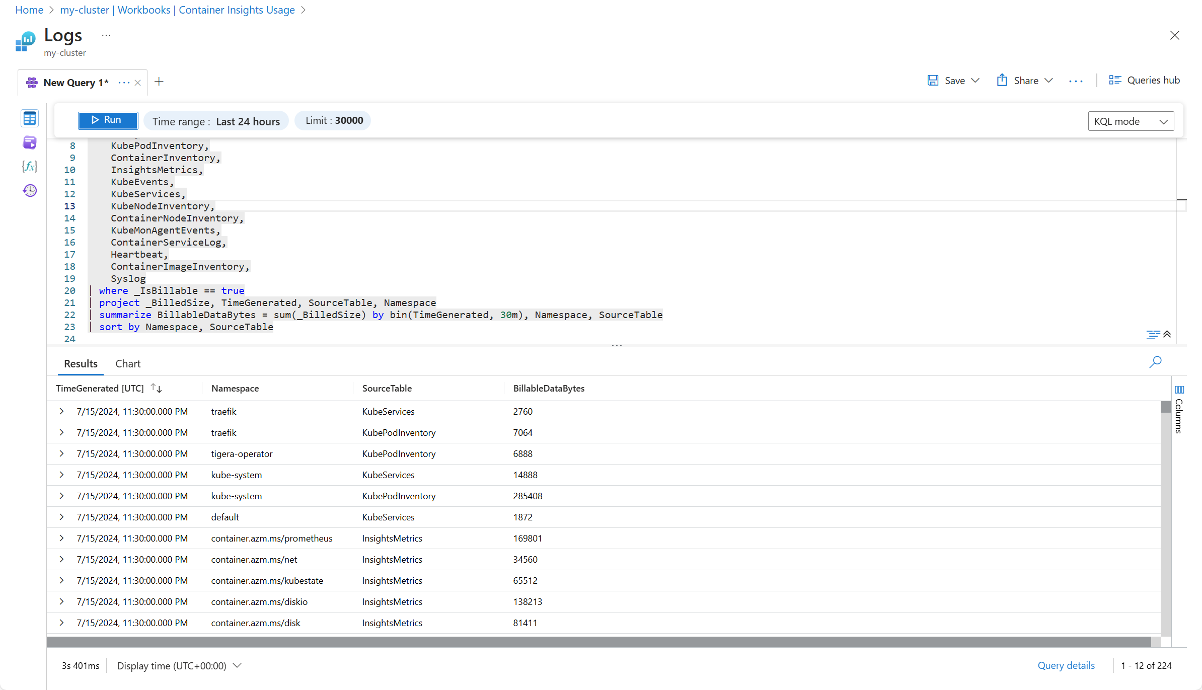 例如,以下屏幕截图显示了对用于按表的日志查询的修改,该查询按命名空间和表显示数据。