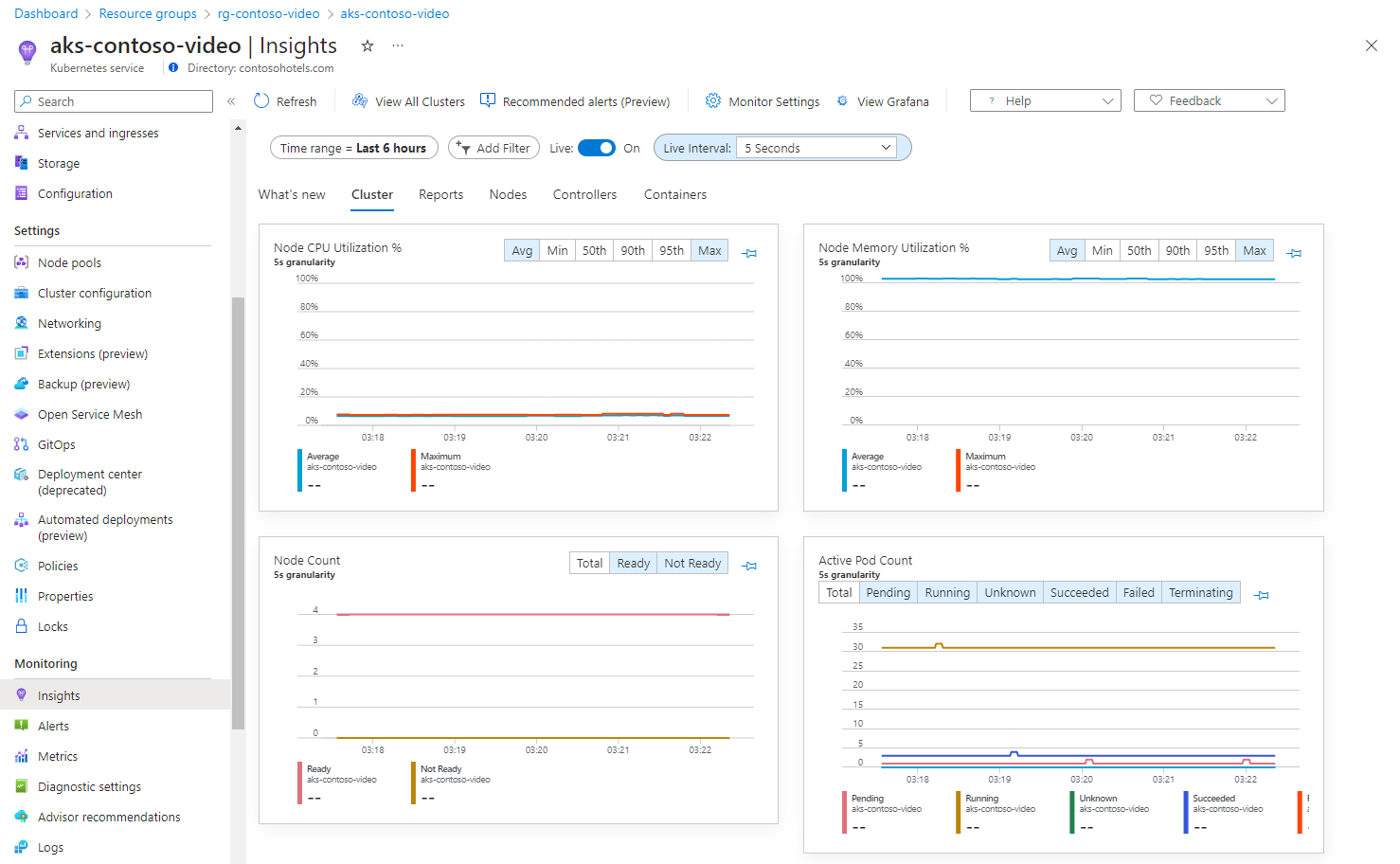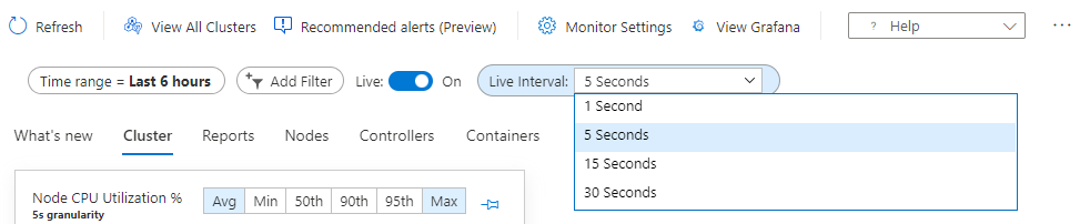 此功能对指标终结点(包括 /api/v1/nodes、/apis/metrics.k8s.io/v1beta1/nodes 和 /api/v1/pods)执行轮询操作。 默认情况下,轮询间隔为 5 秒。 此数据缓存在浏览器中,并绘制在容器见解所包含的四个性能图表中。 每个后续轮询都将绘制到一个滚动显示五分钟的可视化窗口中。 若要查看图表,请滑动“实时”选项以将其启用。