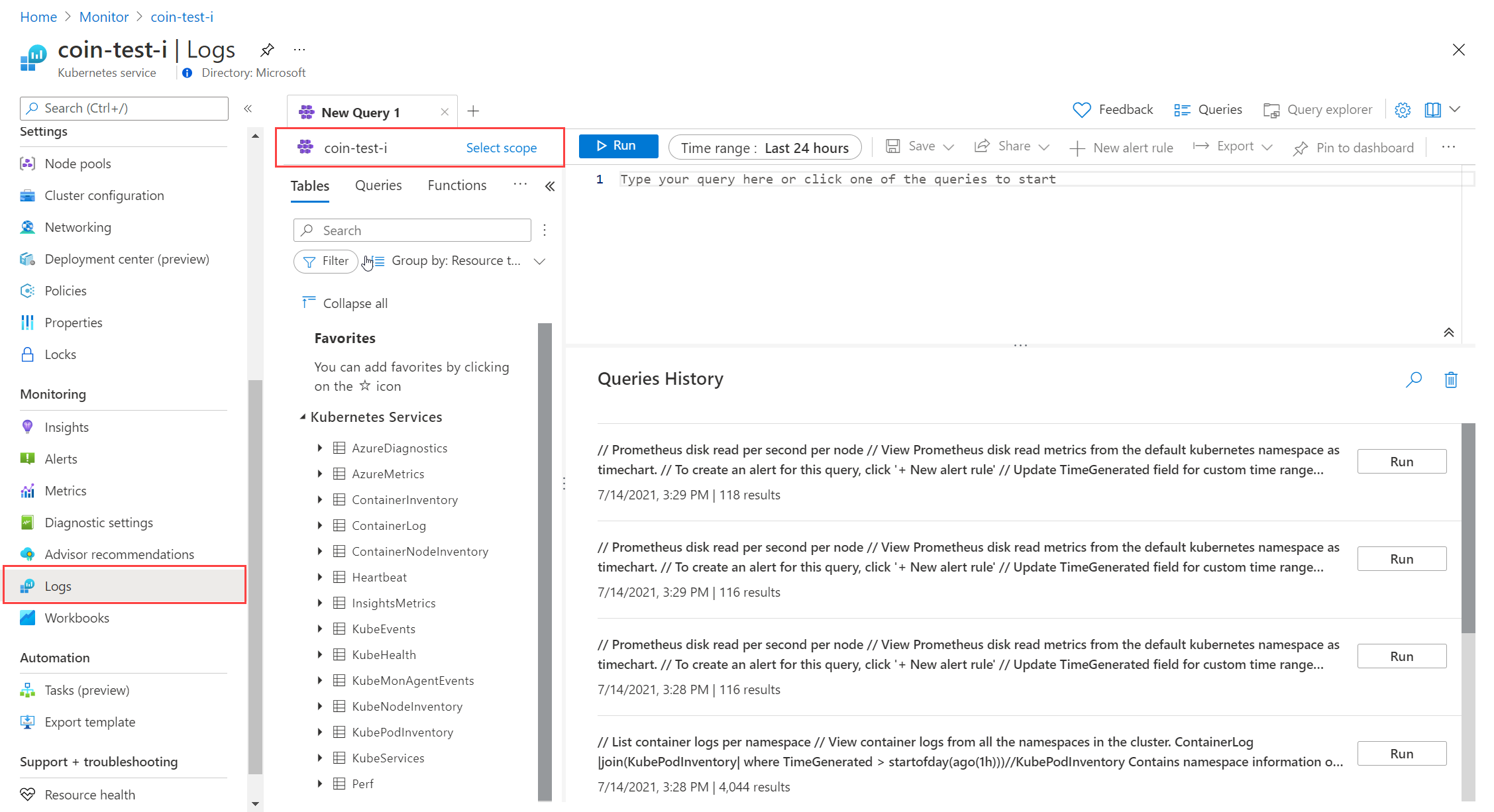 Log Analytics 会话的范围取决于您如何启动它。 若要访问工作区中的所有数据,请从 Azure 门户中的“监视”菜单中选择“日志”。 若要将数据限制为单个 Kubernetes 群集,请从相关群集的菜单中选择“日志”。