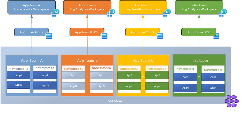 以下部分详细介绍了为每个应用程序或基础结构团队创建单独的 DCR 的不同方法。 每个命名空间将包括一组 K8s 命名空间和一个 Log Analytics 工作区目标。