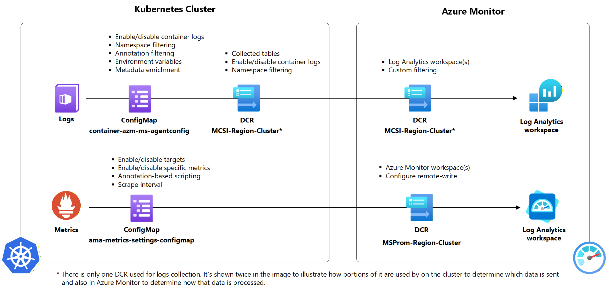 下图演示了如何在 Kubernetes 群集收集数据中使用每个配置方法。 只有一个 DCR 用于日志收集。 图像中显示了两次,以说明代理在群集级别使用了 DCR 中的某些信息,而传递数据后 Azure Monitor 将使用 DCR 中的其他信息。