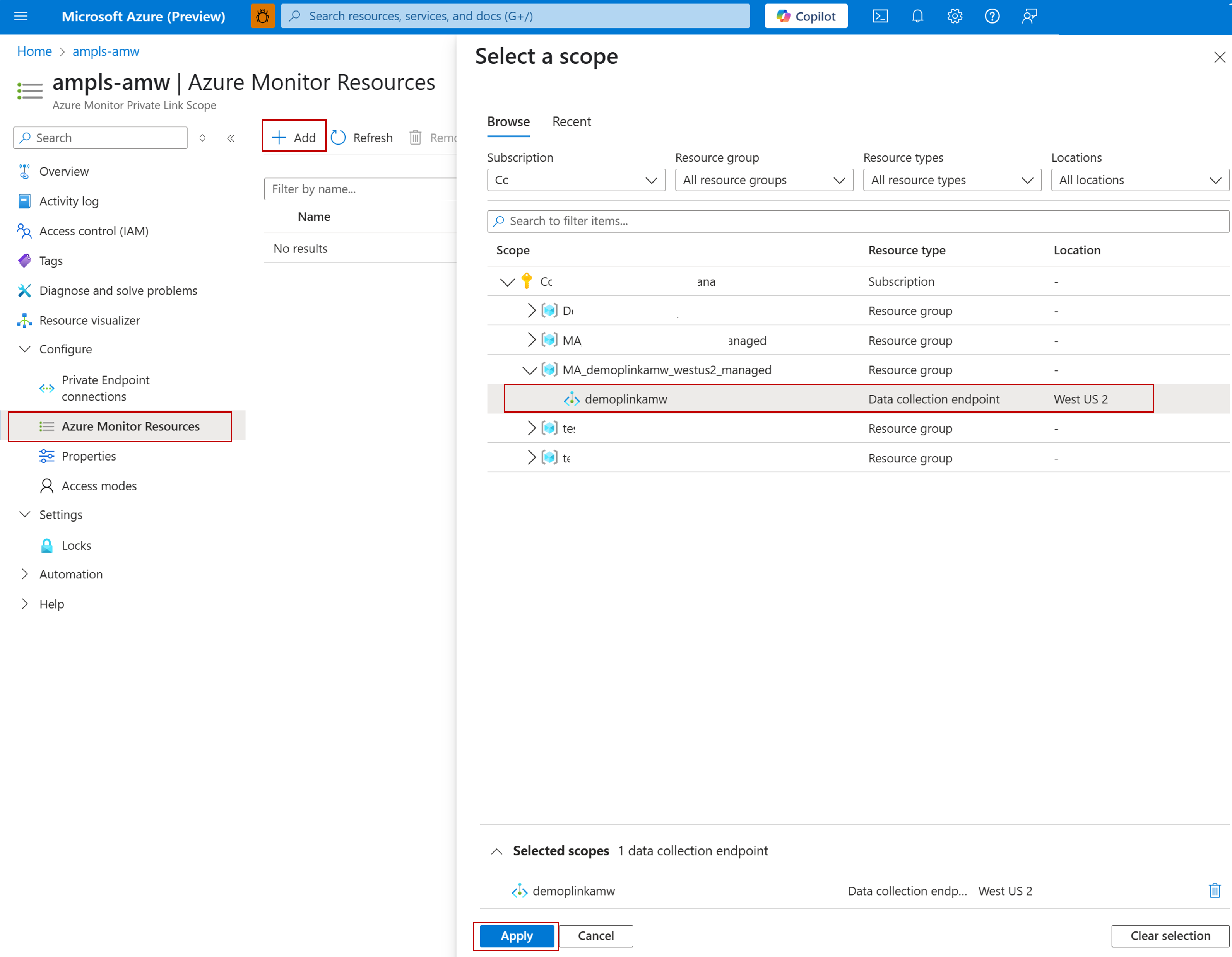 现在,在 Azure 门户中,搜索在上一步中创建的 AMPLS。 转到 AMPLS 概述页,单击 “Azure Monitor 资源”,单击“ 添加”,然后连接在上一步中记录的 Azure Monitor 工作区的 DCE。
