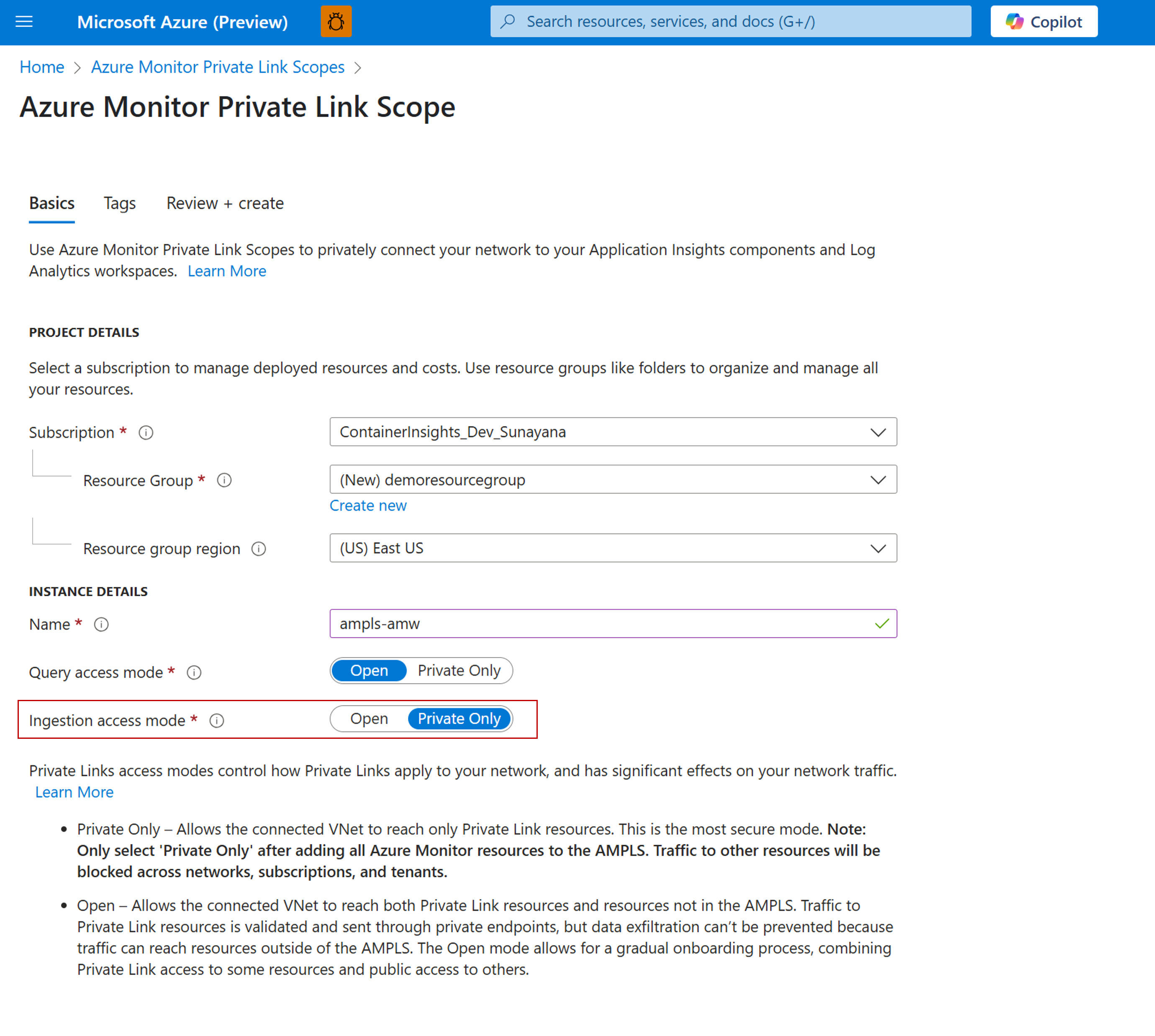 - 创建 Azure Monitor 专用链接范围(AMPLS),并将其与 Azure Monitor 工作区的数据收集终结点连接。