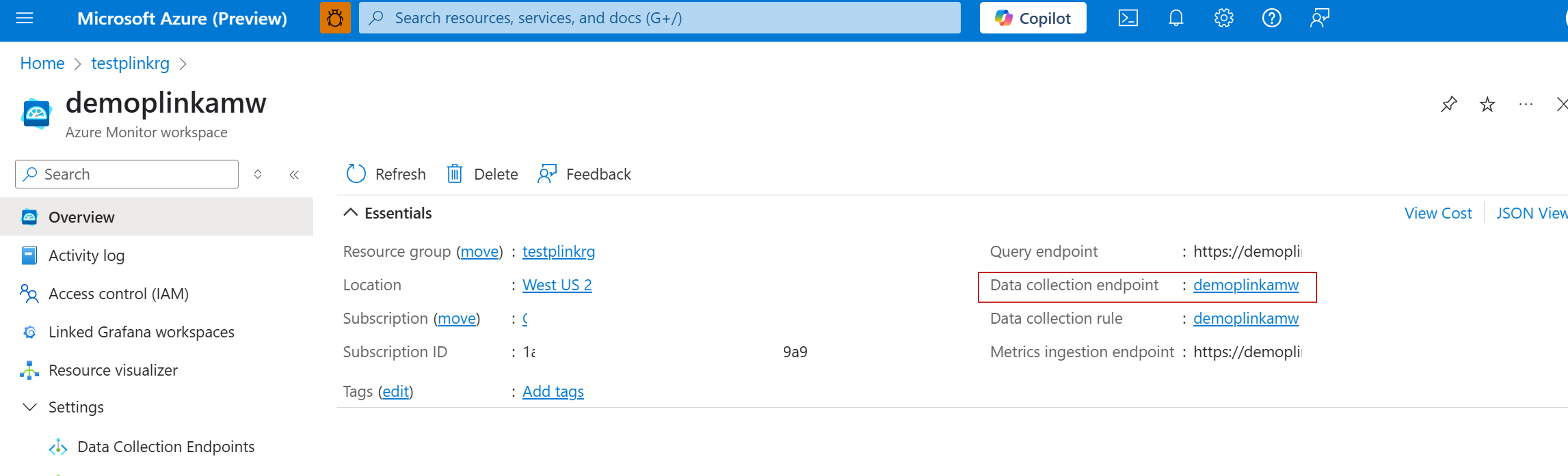 托管的 Prometheus 数据引入的专用链接在存储数据的 Azure Monitor 工作区的数据收集终结点 (DCE) 上配置。 若要标识与 Azure Monitor 工作区关联的 DCE,请在 Azure 门户中从 Azure Monitor 工作区中选择数据收集终结点。