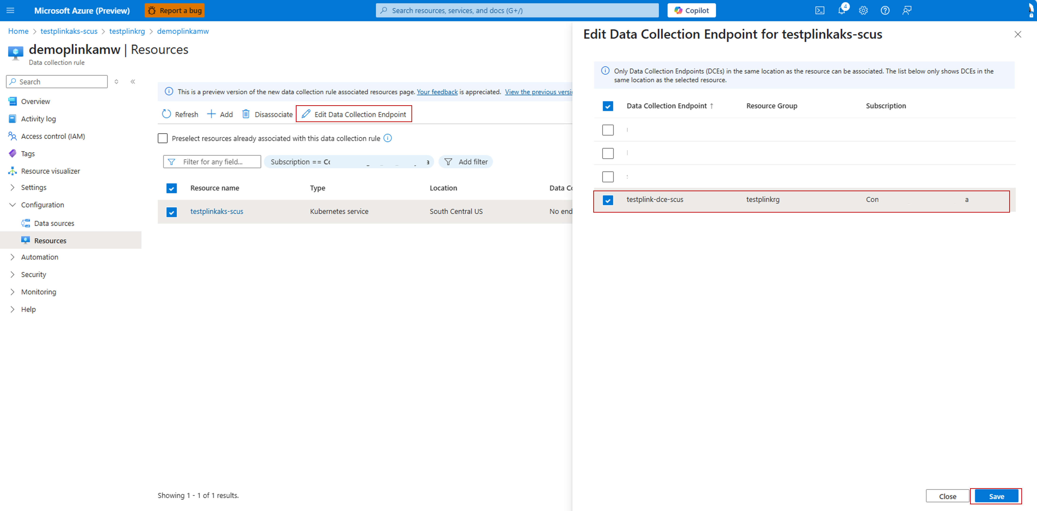 添加 AKS 群集(可能需要刷新页面)后,单击 AKS 群集,然后 编辑终结点的数据收集。 在打开的边栏选项卡中,选择在本部分的步骤 1 中创建的数据收集终结点。 此 DCE 应与 AKS 群集位于同一区域。