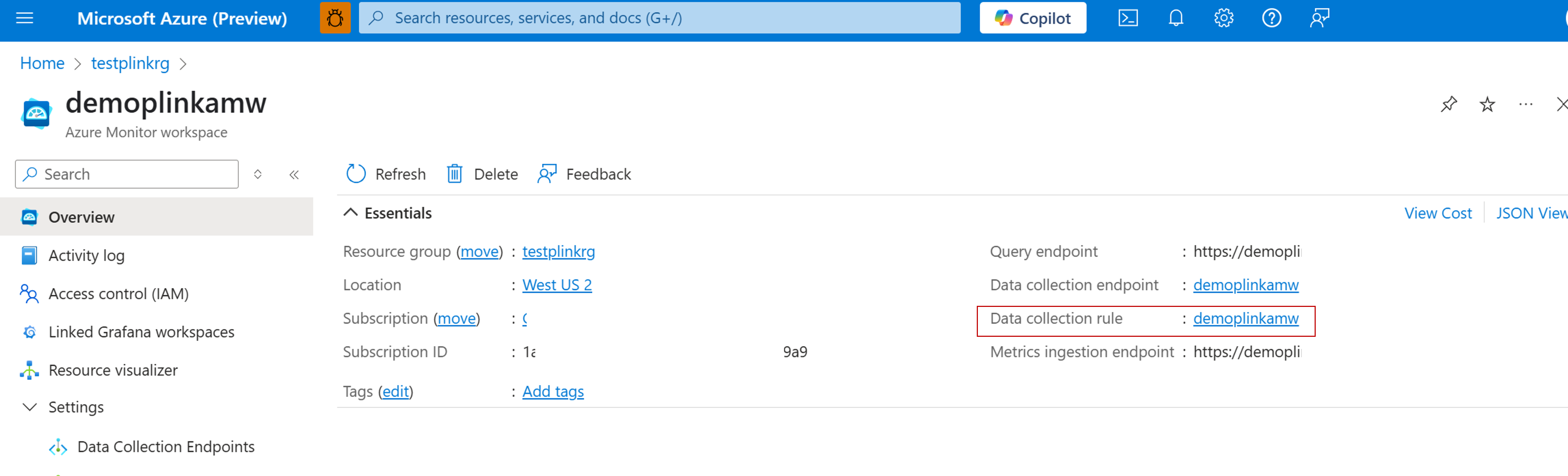 - 从门户中的 Azure Monitor 工作区,在 Azure Monitor 工作区菜单中选择“数据收集终结点”。